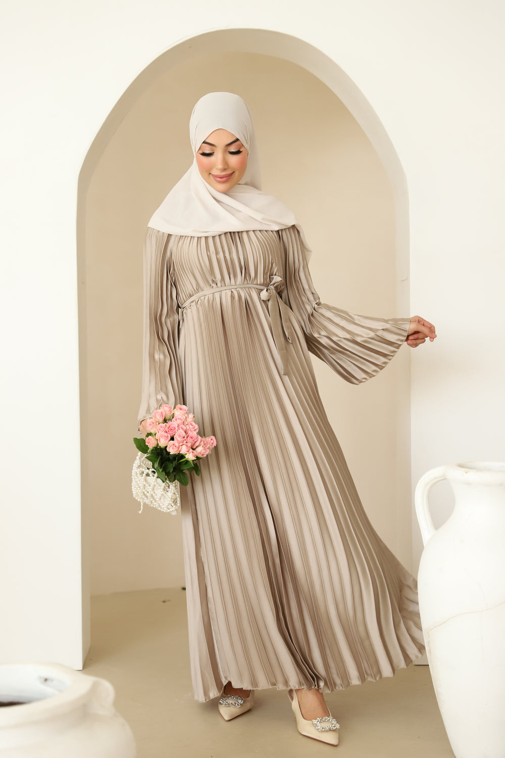 Banu Plissee Kleid mit Trompetenärmeln in Taupe
